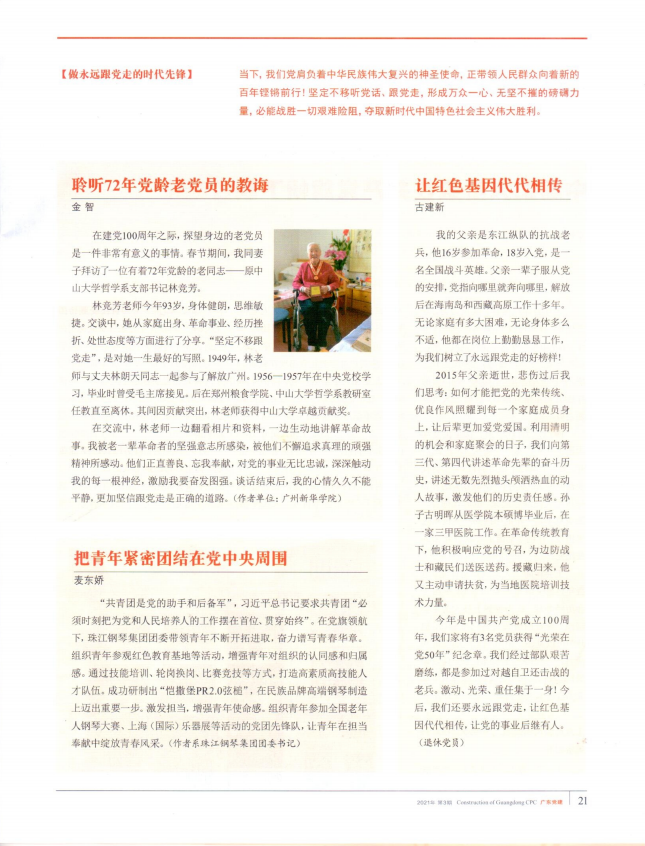 近日,2138CC太阳集团图书馆金智老师的文章《聆听72年党龄老党员的教诲》被收录于2021年第三期《广东党建》(总第75)期。