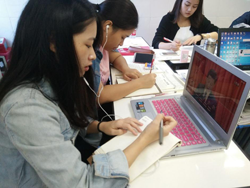 中文系学生党员14级林诗祺、入党积极分子龚丽婷在实习单位广州市卓越里程教育科技股份有限公司收看十九大开幕会报告