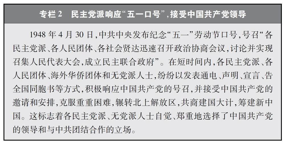 中国新型政党制度形成于协商筹建新中国的伟大实践。1948年4月,中国共产党发布纪念“五一”劳动节口号,提出召开政治协商会议、成立民主联合政府的主张,得到各民主党派、无党派人士和社会各界热烈响应,标志着各民主党派、无党派人士公开自觉接受中国共产党的领导,揭开了中国共产党同各党派、各团体、各族各界人士协商建国的序幕,奠定了中国共产党领导的多党合作和政治协商制度的基础。1949年9月,中国人民政治协商会议第一届全体会议召开,通过《中国人民政治协商会议共同纲领》,规定:在普选的全国人民代表大会召开以前,由中国人民政治协商会议的全体会议执行全国人民代表大会的职权。在普选的全国人民代表大会召开以后,中国人民政治协商会议得就有关国家建设事业的根本大计及其他重要措施,向全国人民代表大会或中央人民政府提出建议案。中国新型政党制度由此确立。