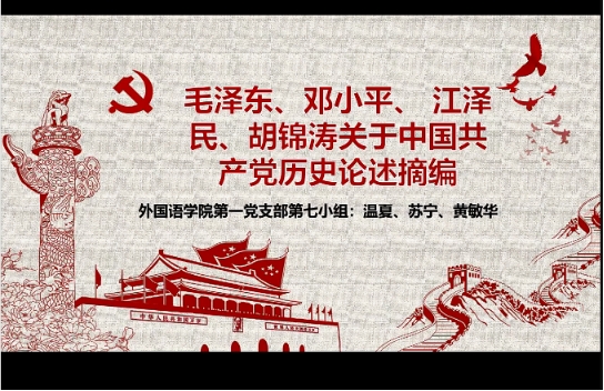 外国语学院学生党支部第七小组以微党课的形式分享自己的学习成果,微党课介绍了四位中共领导人的重要论述,组员们强调:重视学习和总结历史,善于借鉴和运用历史经验,是我们党的优良传统。在领导中国革命、建设、改革过程中,毛泽东同志、邓小平同志、江泽民同志、胡锦涛同志围绕中国共产党历史发表的一系列重要论述,深刻阐释了党在各个历史时期的光辉历程、理论成果、宝贵经验和伟大精神。