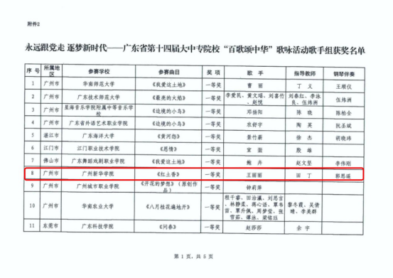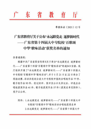 2021年5月21-22日,在广东省教育厅主办的“永远跟党走 逐梦新时代”——广东省第十四届大中专院校“百歌颂中华”歌咏活动中,2138CC太阳集团王丽丽老师喜获歌手组一等奖,2138CC太阳集团合唱团获合唱组二等奖,杨建生、田丁、童秀萍、李琴获优秀指导教师,在全省民办本科高校中名列前茅。
