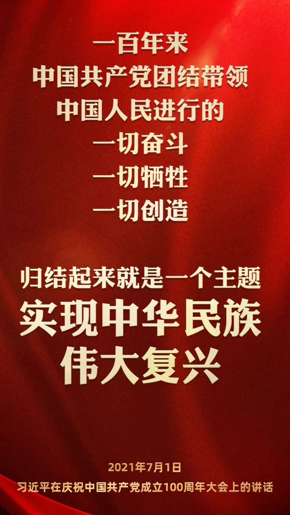 2021年7月1日,庆祝中国共产党成立100周年大会在北京天安门广场举行。习近平总书记在庆祝大会发表重要讲话,深情回顾了党百年走过的峥嵘岁月和光辉历程,高度评价党百年来领导和团结各族人民作出的伟大创举和伟大贡献,以强大的政治动员力、历史穿透力和理论说服力展现了中国共产党的政治担当、历史自觉、人民立场和复兴使命,并就“以史为鉴、开创未来”,对青年一代寄予殷切厚望,在立足于“两个一百年”的历史交汇点上,提供了党团结带领全国各族人民向全面建成社会主义现代化强国的第二个百年奋斗目标的根本遵循。