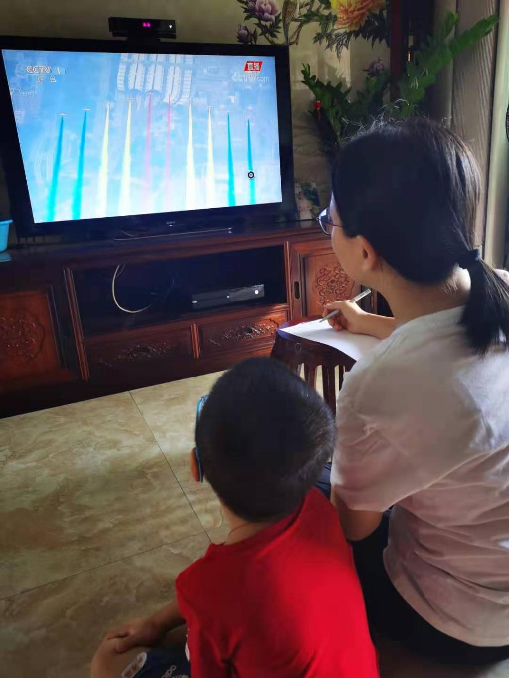 陈美诗与肖月红同志在守值点观看庆祝大会直播